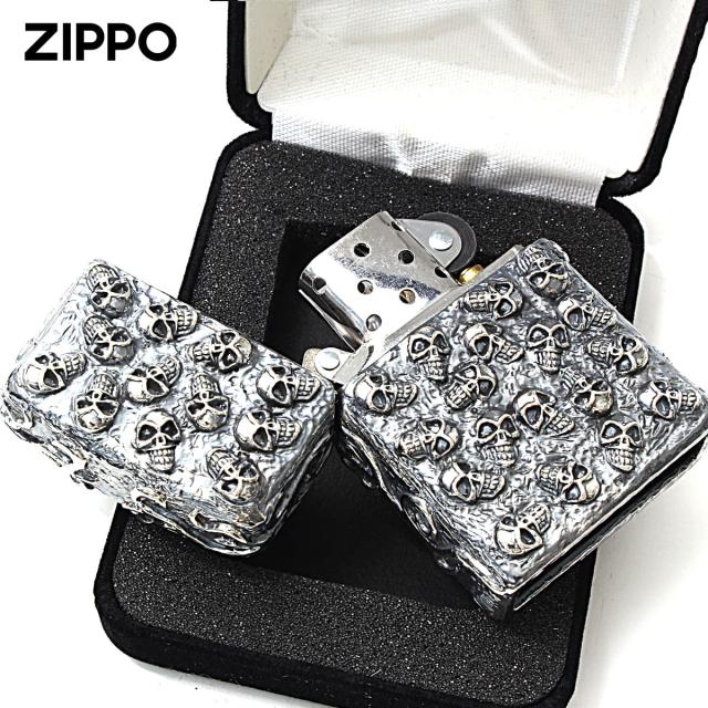 フルカバーメタルのスカル・ジャケットを被せたスペシャルZippoが登場!乾燥重量(オイルを抜いた状態)での重量は、なんと約130グラム!ドクロのディティールにこだわったかなりヘビーな外観と、「ガチンッ」という重厚な開閉音。これはZippoか?と思わせる迫力です。もちろんZippoです!技術的にも難しいトップ(天面)まで加工が施された驚異の5面加工。ヘビー&ワイルドに仕上がってます!