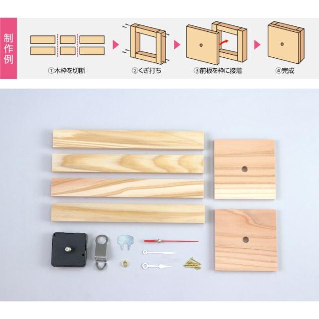 ■セット内容:木部(15×30×250mm)×2、木部(10cm角穴あき)×1、手作り時計キット用クォーツ時計×1、釘×10
