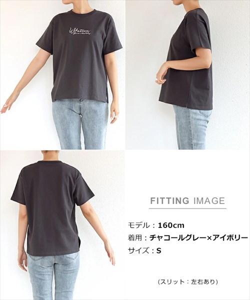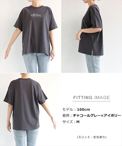 送料無料 Tシャツ 半袖 ロゴ コットン 綿100% ロゴ刺繍 トップス カットソー レディース クルーネック サイドスリット ベーシック オーバーサイズ 体型カバー S/Mサイズ 春 夏 秋 おしゃれ カジュアル かわいい お出かけ デート 楽ちん ゆったり Ladies 20代 30代 40代