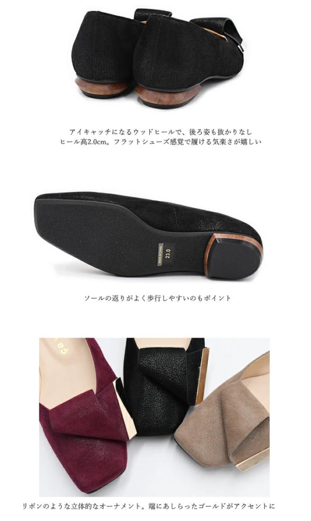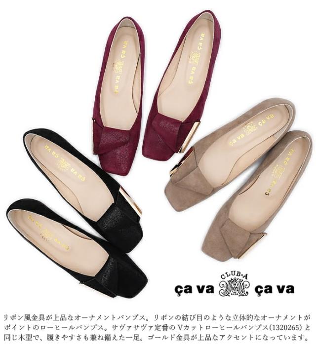 リボン風金具が上品なオーナメントパンプス。リボンの結び目のような立体的なオーナメントが ポイントのローヒールパンプス。サヴァサヴァ定番の Vカットローヒールパンプス(1320265) と 同じ木型で、履きやすさも兼ね備えた一足。