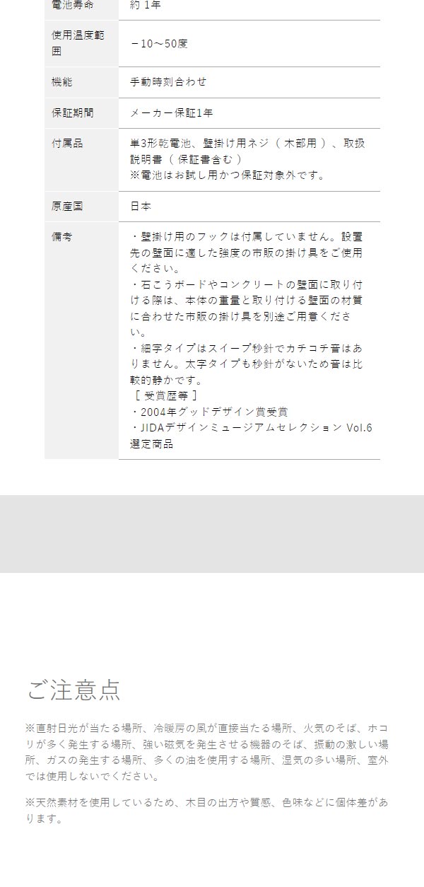 プロダクトデザインの巨匠、渡辺力が手がけた掛け時計。こだわりの書体が映える白い文字盤を木枠で囲んだモダンなデザイン。スイープ秒針の細字・秒針なしの太字の2種類から選べます。