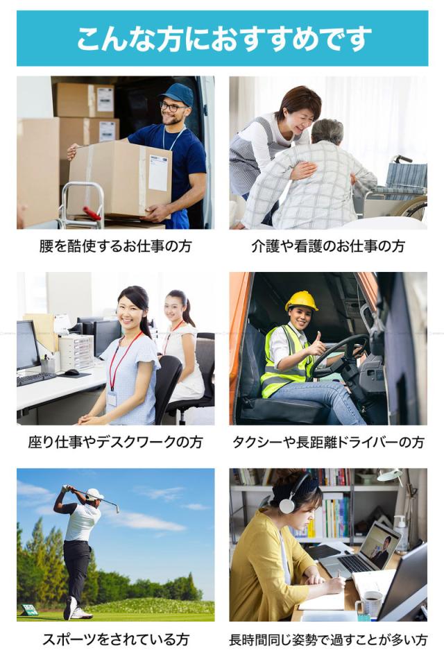 腰を酷使するお仕事、介護や看護、長時間の立ち仕事、座り仕事、デスクワーク