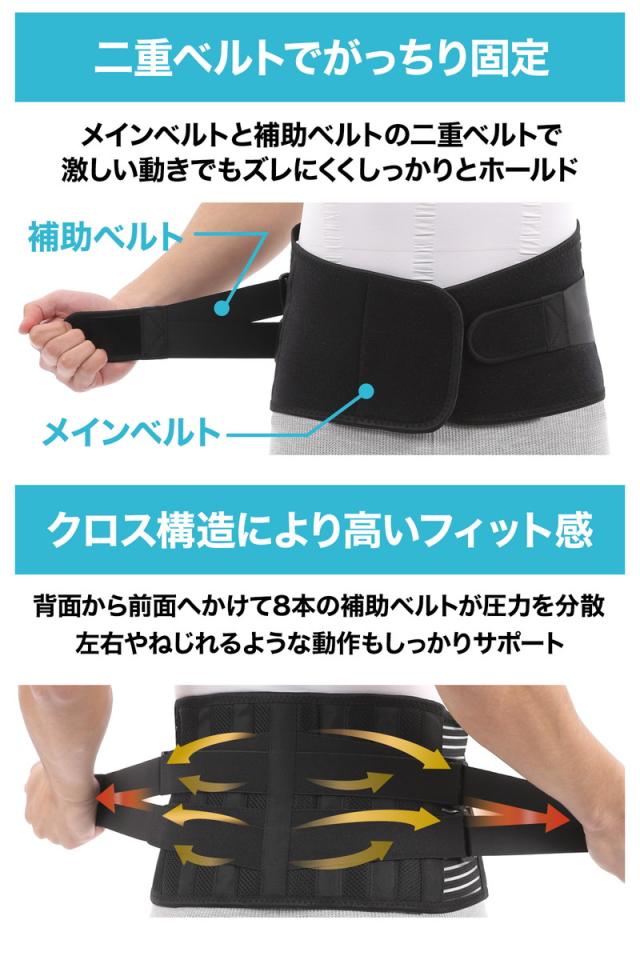 二重ベルトと6本の支柱で強力固定、激しい動きでもズレにくくしっかりホールド