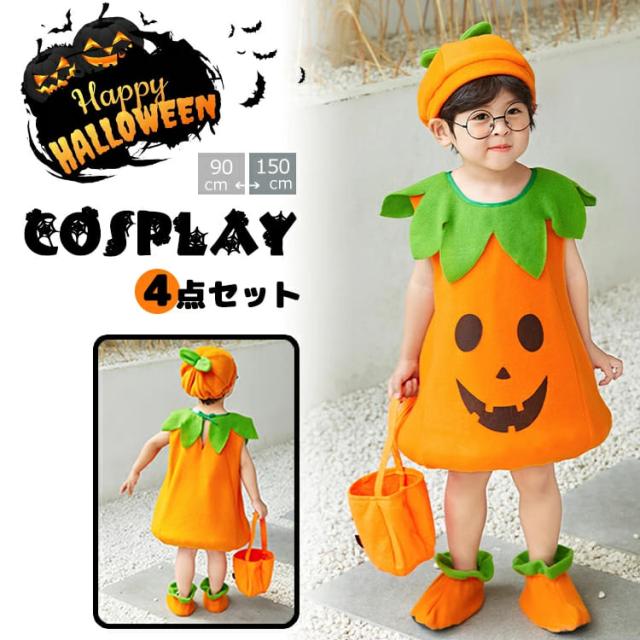 ハロウィン 衣装 子供 かぼちゃ 仮装 男の子 女の子 帽子 お菓子入れ バッグ 4点セット 着ぐるみ コスプレ パンプキン ジャックオーランタン キッズ 子ども こども ジュニア 可愛い かわいい おもしろ 幼稚園 小学生 90 100 110 120 130 140 150cm