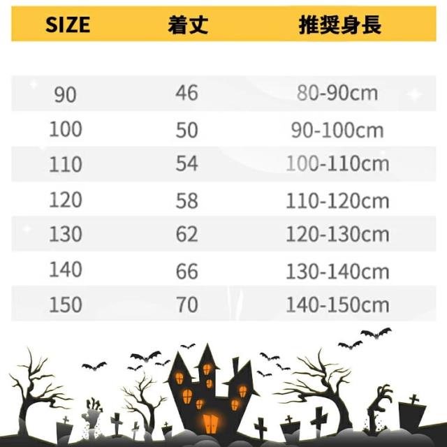 | 90:推奨身長80〜90cm/着丈:46cm 100:推奨身長90〜100cm/着丈:50cm 110:推奨身長100〜110cm/着丈:54cm 120:推奨身長110〜120cm/着丈:58cm 130:推奨身長120〜130cm/着丈:62cm 140:推奨身長130〜140cm/着丈:66cm 150:推奨身長140〜150cm/着丈:70cm |