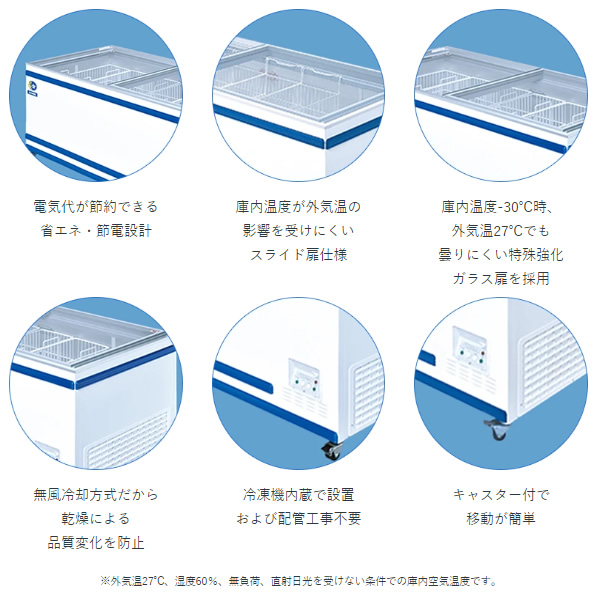 「ジャンボ無風冷凍ショーケース」 アイスクリームから魚介類食肉まで 冷凍食品の大量ストックと販売に。 ■外形寸法 W1769×D819×H757 mm ■有効内容量 460L ■電源 AC200V 1φ 50/60Hz ■消費電力 370/450 (W.50/60Hz) ■製品質量 99 KG ■温度調整範囲 -30〜-20℃ ※こちらの商品は、車上渡しになります。(荷降ろしからお客様に手伝っていただきます) 開梱設置のメーカー手配不可。エレベーターのない階層上げ・カウンター担ぎ上げ等は見込んでおりません。 ※記載は商品仕様の一部です。仕様説明不足等の理由での返品はできません。特に適合等は必ずご確認ください。