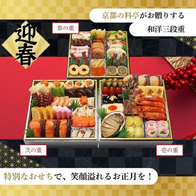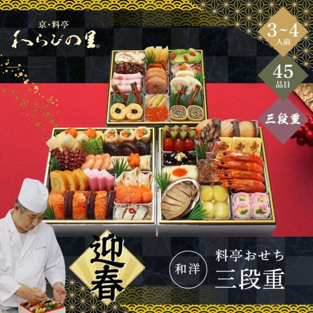 おせち 2026 わらびの里 【12/31着】 時間指定不可 京・料亭 和洋料亭おせち三段重 3〜4人前 45品目 御節 お節 正月 冷蔵 和洋折衷