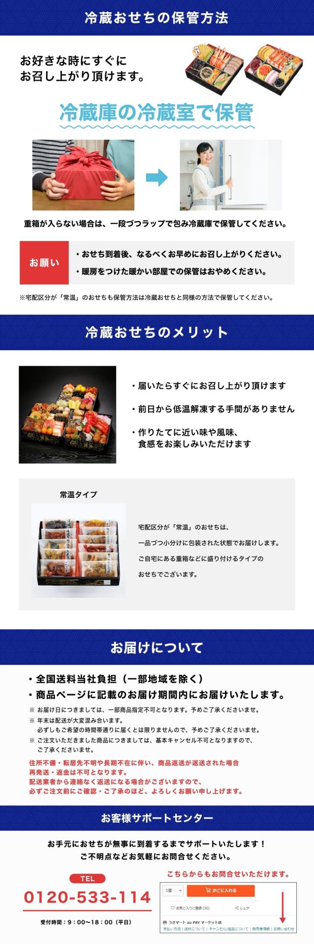 鮭柚庵焼/3切、伊達巻/3切、紅白蒲鉾/3切、チキンマリネ/約35g、サーモンマリネ/約20g、こはだ粟漬/3切、くらげ酢/約25g、三色信田巻/3個、六方さつま芋/3個、穂付筍土佐煮/3切、蛸桜煮/3切、海老沢煮/3尾、椎茸旨煮/3個、一口焼き湯葉/3切、捻り梅人参/3個、絹さや/3枚