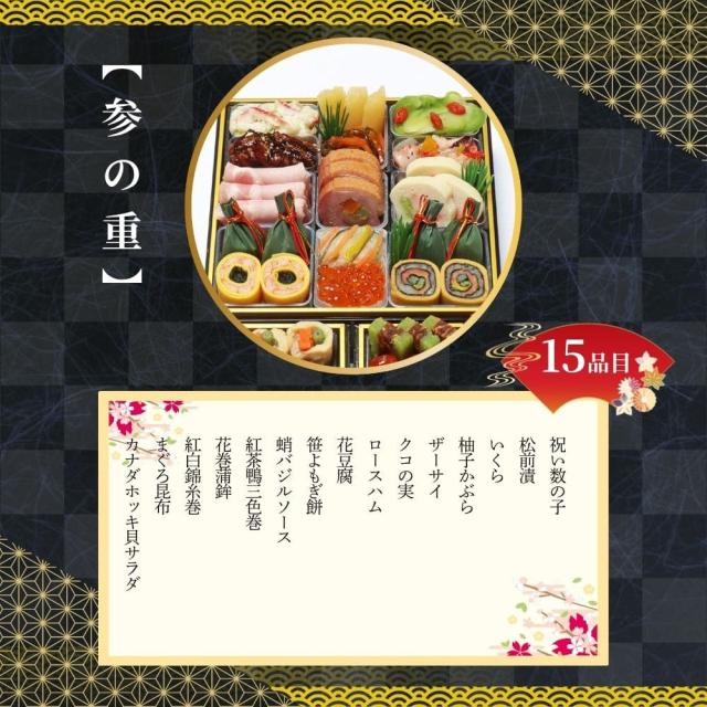 海老艶煮/4尾、鮑旨煮/1個、鰆柚庵焼/3切、栗きんとん/約70g、鯛砧巻/4切、京なます/約25g、北欧サラダ/約30g、とび子/約3g、柚子柿グリーンサンド/3切、ドライトマトワイン煮/3個、寿厚焼き玉子/3切、棒鱈旨煮/約30g、田作り照煮/約7g、福豆葡萄煮(金箔)/約25g