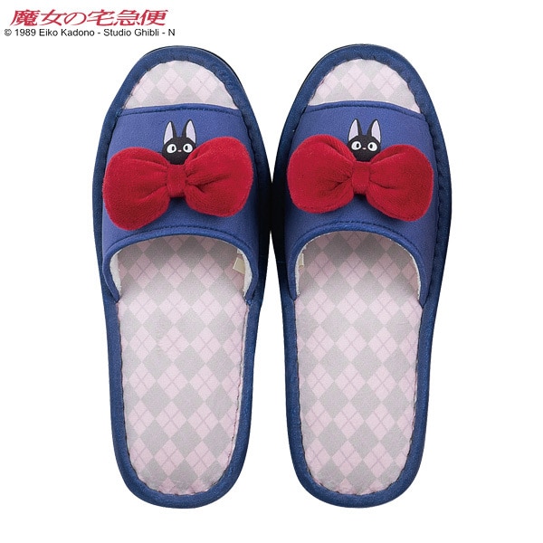 ふっくらとしたリボンをモチーフにし、リボンからジジが顔を出している、可愛らしいデザインの室内用スリッパ(内寸・約24.0cm)、魔女の宅急便・あこがれリボン。作中のイメージが浮かぶようなネイビーブルーとレッドの2配色。甲が高めで、スッと履けて、サッと脱げる、。足裏への負担をやわらげてくれる低反発ウレタン入り。洗濯機で丸洗濯機で丸洗いできるので、衛生的。ウオッシャブル(タンブラー乾燥は不可)。裏面は滑りにくく、静音効果。