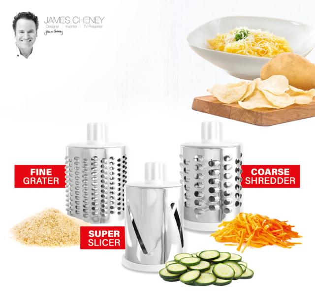 替え刃はスライスドラム・細切りドラム・すりおろしドラムの3種類。