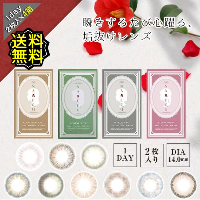 カラコン ワンデー 度あり NARERU ナレル 1箱2枚入り×4箱 8枚 直径14.0mm BC8.6 低含水 UVカット ブラウン グレー ブルー オリーブグリーン 小さめ