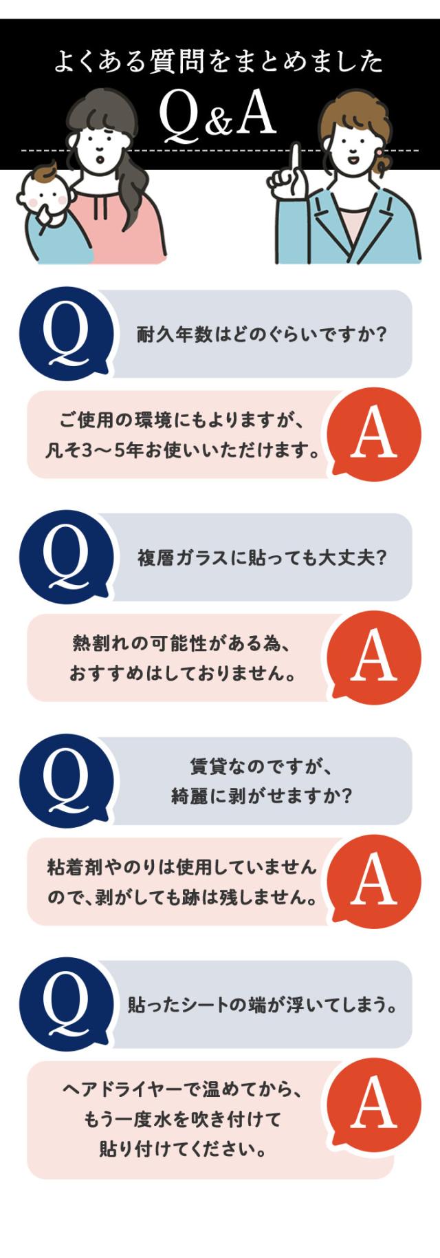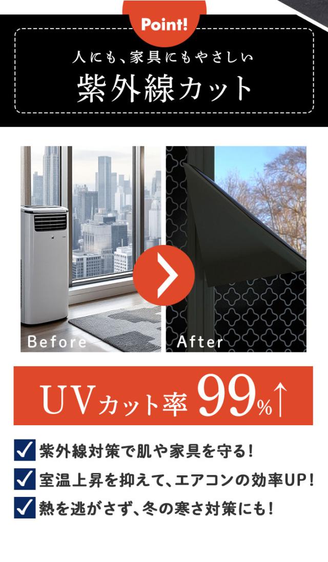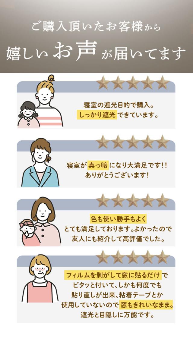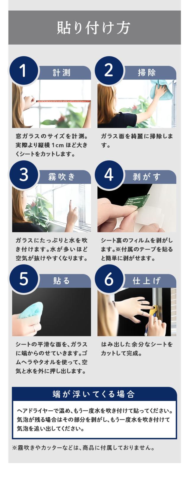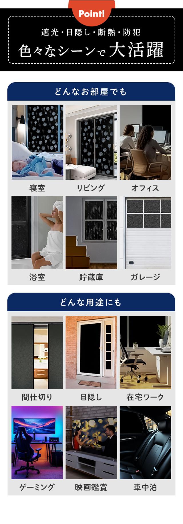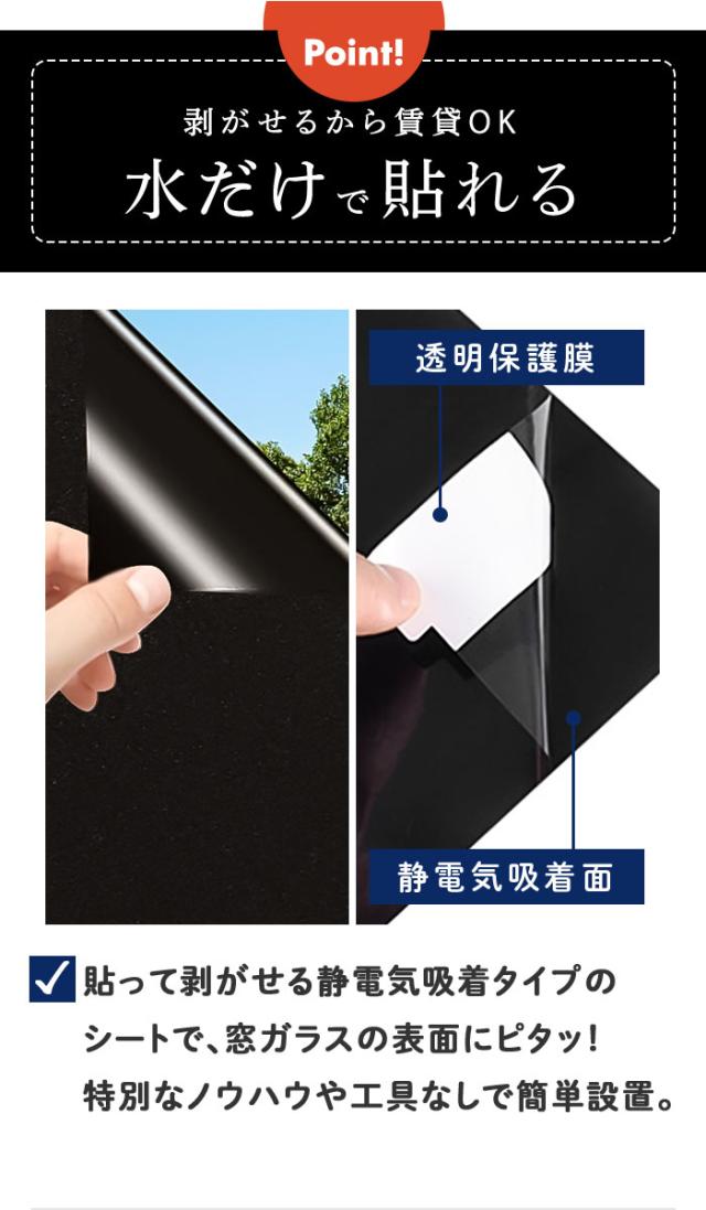 | 商品説明 | ・窓ガラスにピタッと貼り付けて、100%遮光!快適な睡眠とプライバシーを守りたい方に最適な「遮光シート」(45cmタイプ)が新登場。 ・昼間の太陽の光はもちろん、夜間の屋外からの光漏れからも、お部屋を24時間保護。夜勤でお仕事をされている方や、お昼寝する乳幼児の安眠確保に。 ・光と同時に紫外線もカットするため、日焼けが気になる方や、家具や内装の色褪せ予防にも効果的。 ・黒色不透明のシートが建物外部からの視線を遮断!おうち時間とプライバシーを大切にする方にもオススメ。 ・貼ってはがせる静電気吸着タイプのシートで、窓ガラスの表面にピタッ!特別なノウハウや工具なしに、どなたでも貼り付け可能!(※表面が平らな、透明平面ガラスにご使用ください。擦りガラス、型板ガラス、網入りガラスなどにはご使用になれません。) ・汚れや水滴がサッと拭き取れるPVC(ポリ塩化ビニル)素材だから、お手入れも簡単、手間いらず。 ・格子付きの窓や、小さなフィックス窓にちょうどいい45cm×2mサイズ。 ・シンプルな「無地つや消し」(YYT601Bタイプ)、幻想的な「雪の結晶」(YYT086タイプ)、スタイリッシュな「斜めレンガ調」(YYT010タイプ)など、選べるパターンバリエーション。 (※カラーによりパターンバリエーションが異なります) |