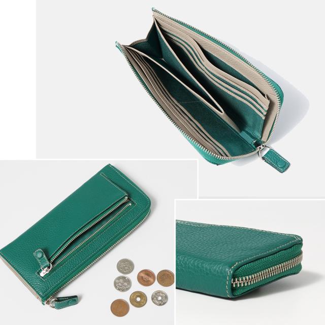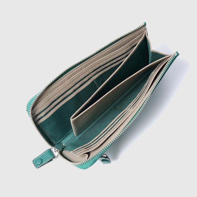 シュリンク型押(イタリア産)でしっかりと立体感を付け、イタリア産ならではベース処理技術と味出し加工によりソフトさを生かした仕上がり。内面にはトープ色を使ったクリーンなカラーコンビも特徴です。