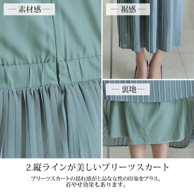 スカート部分は人気の高いプリーツデザインで女性らしい雰囲気を表現。