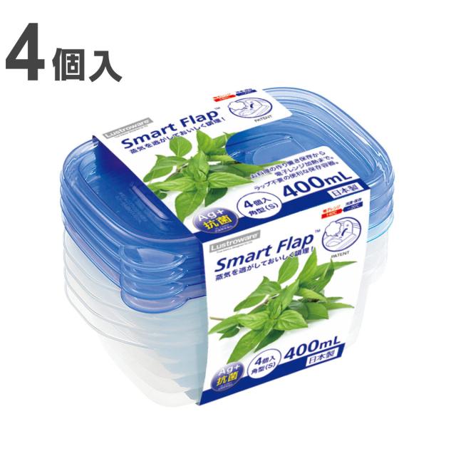 保存容器 400ml スマートフラップ BA 角型 S 4個入 ( 日本製 抗菌 プラスチック フードコンテナ 冷凍 冷蔵 保存 容器 プラスチック容器 食品保存容器 抗菌加工 Ag+ 目盛り付き 電子レンジ対応 エアー弁 作り置き )