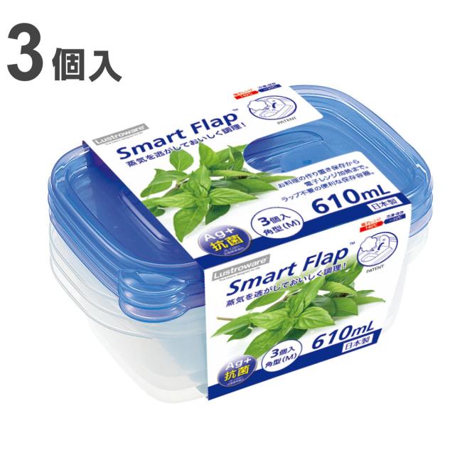 保存容器 610ml スマートフラップ BA 角型 M 3個入 ( 日本製 抗菌 プラスチック フードコンテナ 冷凍 冷蔵 保存 容器 プラスチック容器 食品保存容器 抗菌加工 Ag+ 目盛り付き 電子レンジ対応 エアー弁 作り置き )