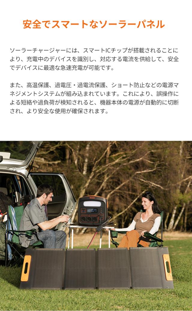 ポータブル電源と組み合わせて、いつでも最大電力を生成できるように設計されています。高温保護や過電圧・過電流保護、ショート防止などの電源マネジメントシステムを搭載しており、誤操作による短絡や過負荷を検知し、ポータブル電源への充電を自動的にオフにすることができます。