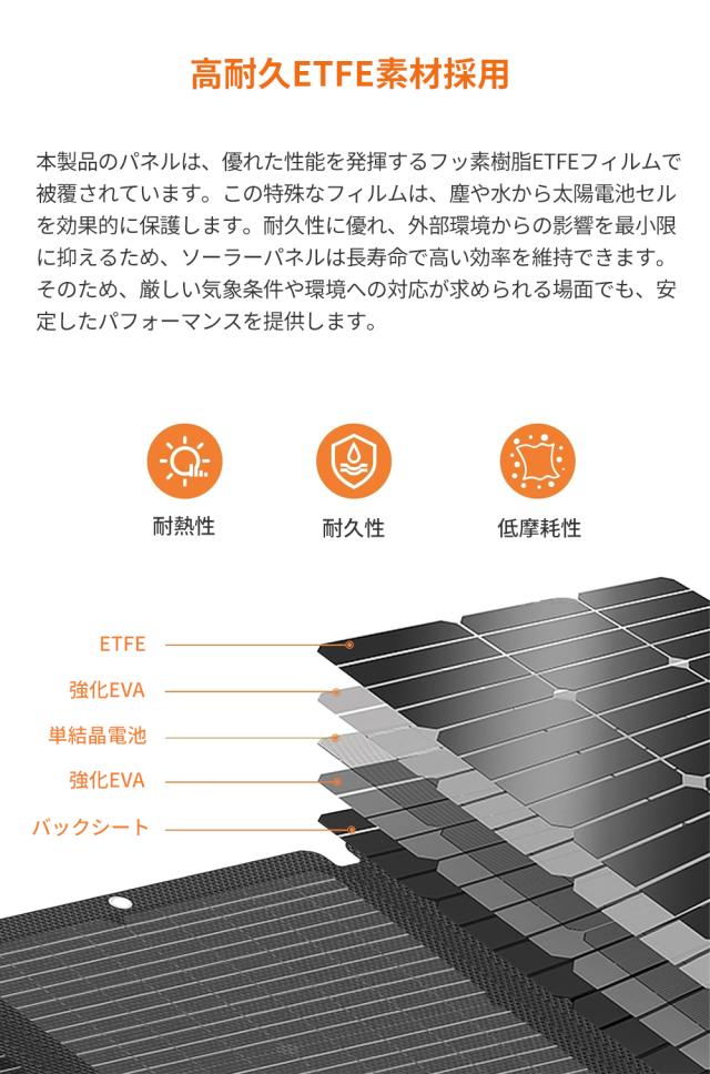 本製品のパネルは、優れた性能を発揮するフッ素樹脂ETFEフィルムで被覆されています。この特殊なフィルムは、塵や水から太陽電池セルを効果的に保護します。耐久性に優れ、外部環境からの影響を最小限に抑えるため、ソーラーパネルは長寿命で高い効率を維持できます。そのため、厳しい気象条件や環境への対応が求められる場面でも、安定したパフォーマンスを提供します。