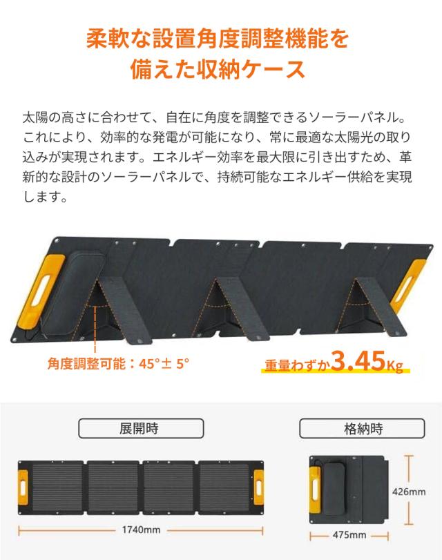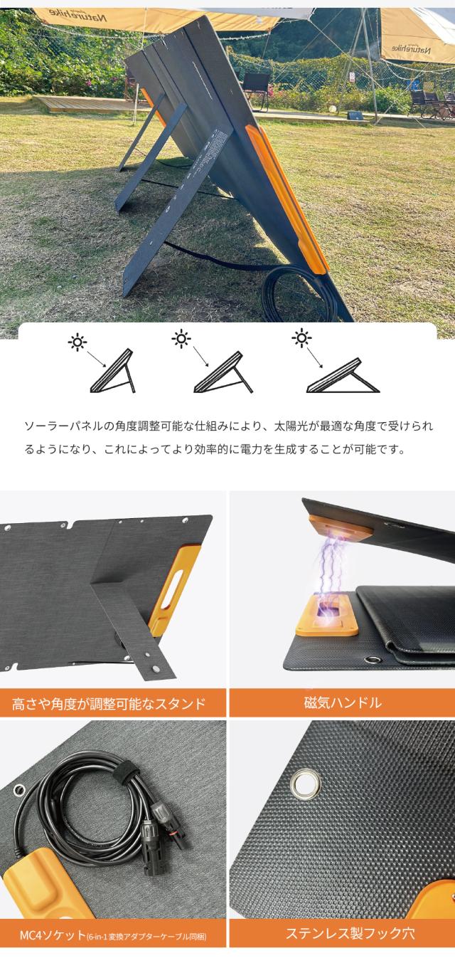 軽量で薄く、持ち運びに便利なデザインです。短距離旅行、釣り、キャンプ、自家発電、車中泊、停電対策、アウトドア、地震、災害、緊急時などにポータブル電源への充電が可能です。ソーラーパネルとポータブル電源のセットがあれば、緊急時にも冷暖房器具や調理器具などを使用することができ、家族も安心です。
