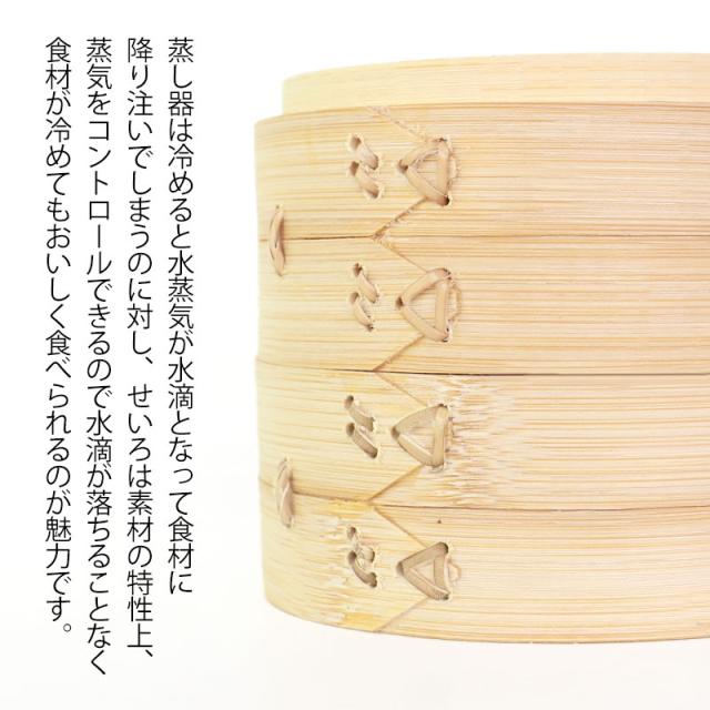 蒸し器は冷めると水蒸気が水滴となって食材に降り注いでしまうのに対し、せいろは素材の特性上、蒸気をコントロールできるので水滴が落ちることなく食材が冷めてもおいしく食べられるのが魅力です。