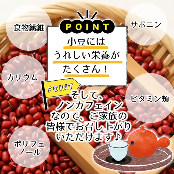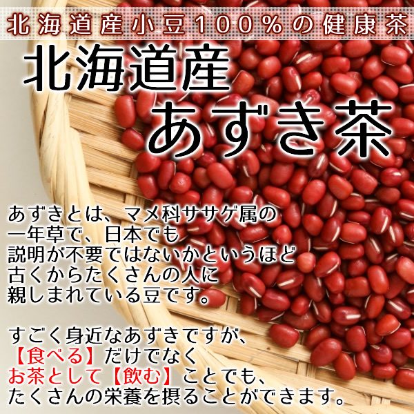 | あずきとは、マメ科ササゲ属の一年草で、日本でも説明が不要ではないかというほど古くからたくさんの人に親しまれている豆です。 すごく身近なあずきですが、【食べる】だけでなくお茶として【飲む】ことでも、たくさんの栄養を摂ることができます。 厳選した北海道産の小豆のみを使用し、丁寧に焙煎した後しっかり選別しその後粉砕したものをティーパックに詰めております。 小豆は100%北海道産であり、加工する工場も国内ですので、安全・安心です。 小豆にはうれしい栄養がたくさんあるといわれており、その一部を挙げますと、食物繊維やポリフェノール、ビタミン類、サポニン、カリウムなどです! あずき茶はノンカフェインなので、ご家族の皆様でお召し上がりいただけます♪ |