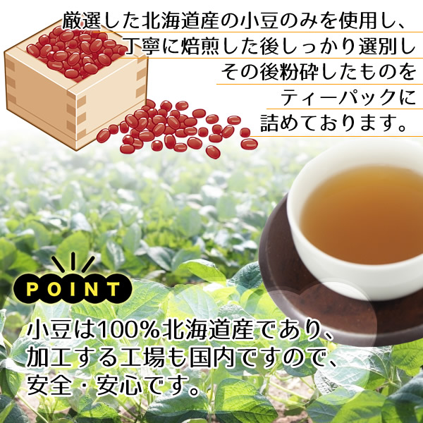 厳選した北海道産の小豆のみを使用し、丁寧に焙煎した後しっかり選別しその後粉砕したものをティーパックに詰めております。