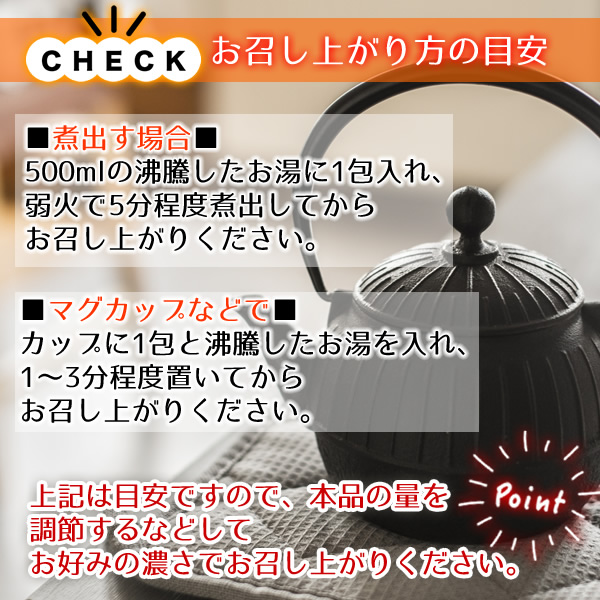 ■煮出す場合■ 500mlの沸騰したお湯に1包入れ、弱火で5分程度煮出してからお召し上がりください。 ■マグカップなどで■ カップに1包と沸騰したお湯を入れ、1〜3分程度置いてからお召し上がりください。 上記は目安ですので、本品の量を調節するなどしてお好みの濃さでお召し上がりください。 |