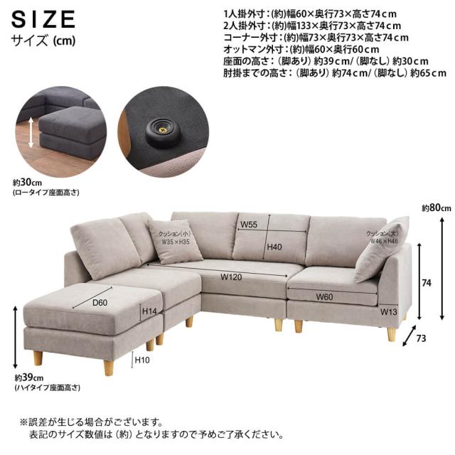 コーナー : 幅 73cm x 奥行 73cm x 高さ74cm