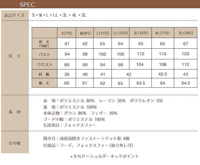■素材:表地 ポリエステル60%、レーヨン35%、ポリウレタン5%、裏地 ポリエステル100%、、本体詰物 ダウン80%、フェザー20%、フード中綿 ポリエステル100%、、毛皮部分 フォックスファー