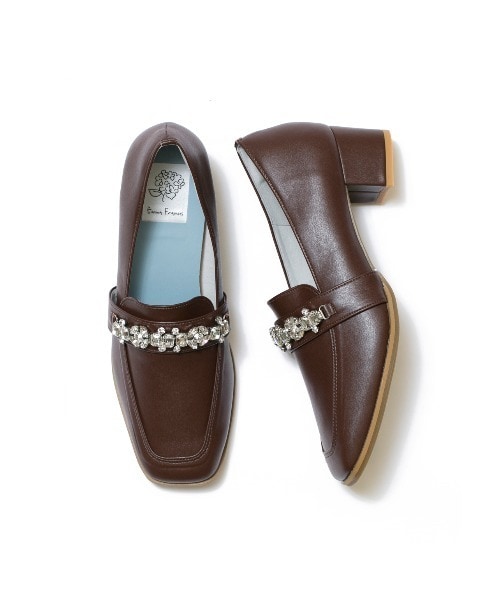 ヒールローファーに存在感のあるガラスビジューの飾りをあしらった高級感のある1足。