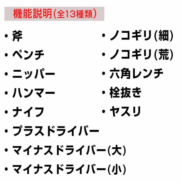 ““斧・ペンチ・ニッパー・ハンマー・ナイフ・プラスドライバー・ノコギリ(細/荒)・マイナスドライバー(大/小)・六角レンチ・栓抜き・ヤスリ”を備えた13WAYマルチツールでBBQやキャンプシーン、災害時、バトニング時などに活躍します。