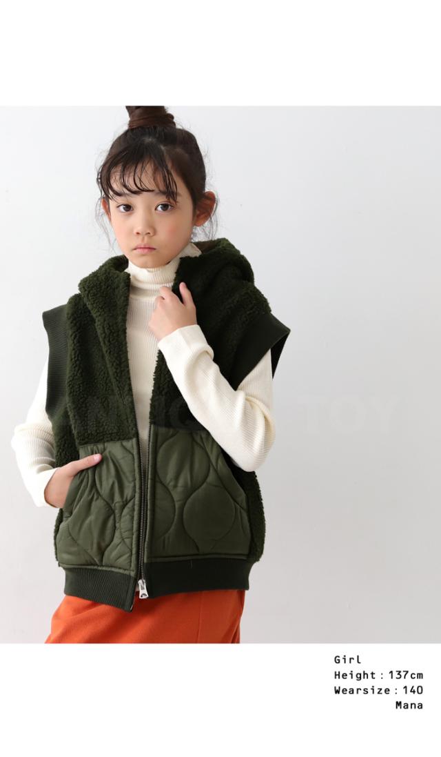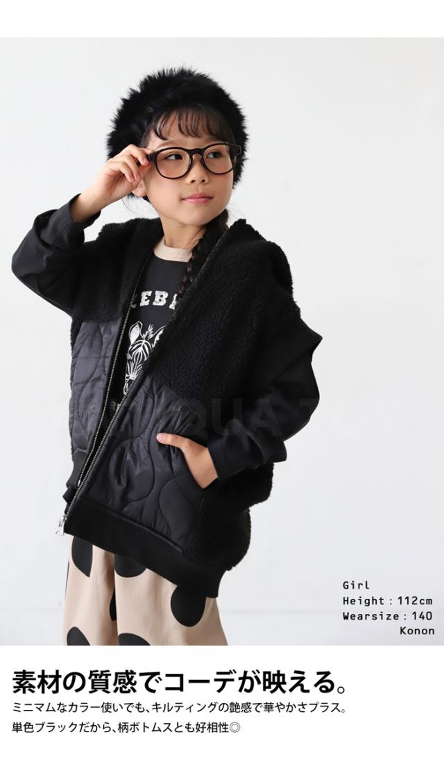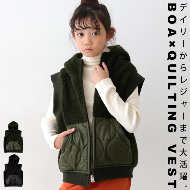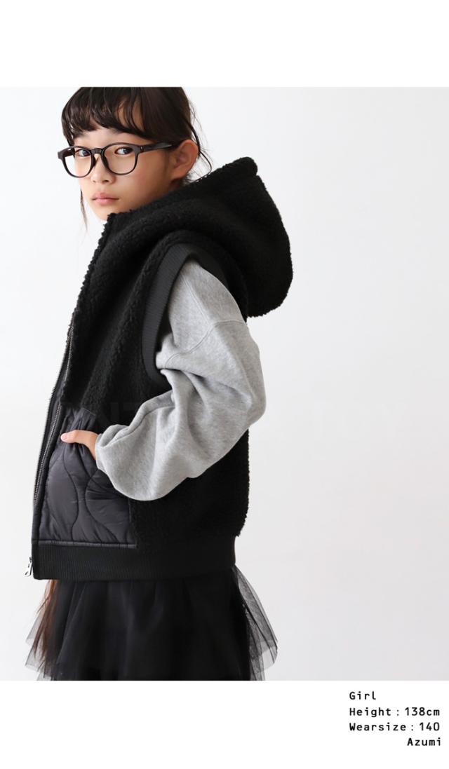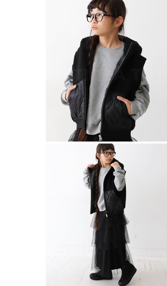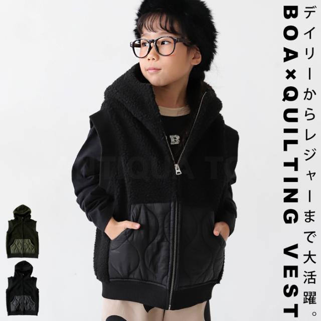 yt-00005 キッズ 子供服 男の子 女の子 ジュニア 低学年 高学年 中学生 中高生 アウター ボア キルティング 異素材 ゆったり 前開き 無地 羽織り ノースリーブ リブ フード