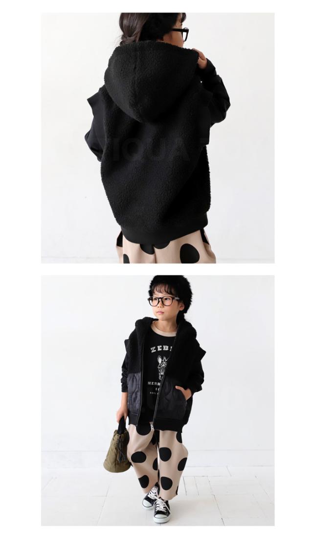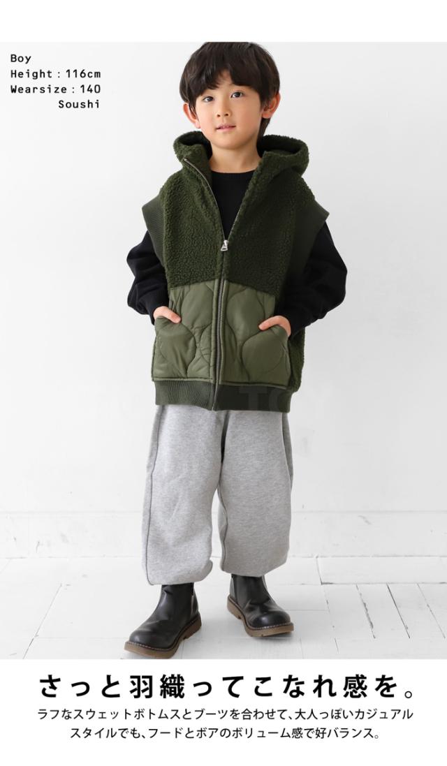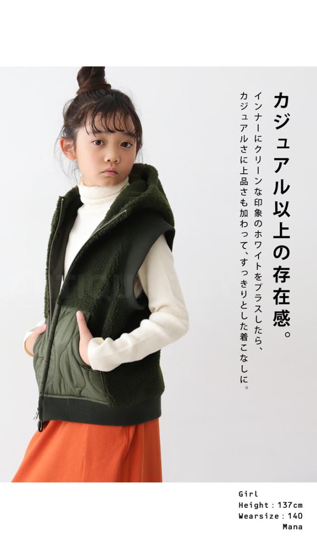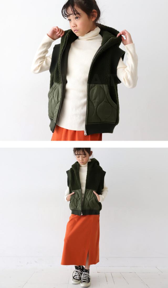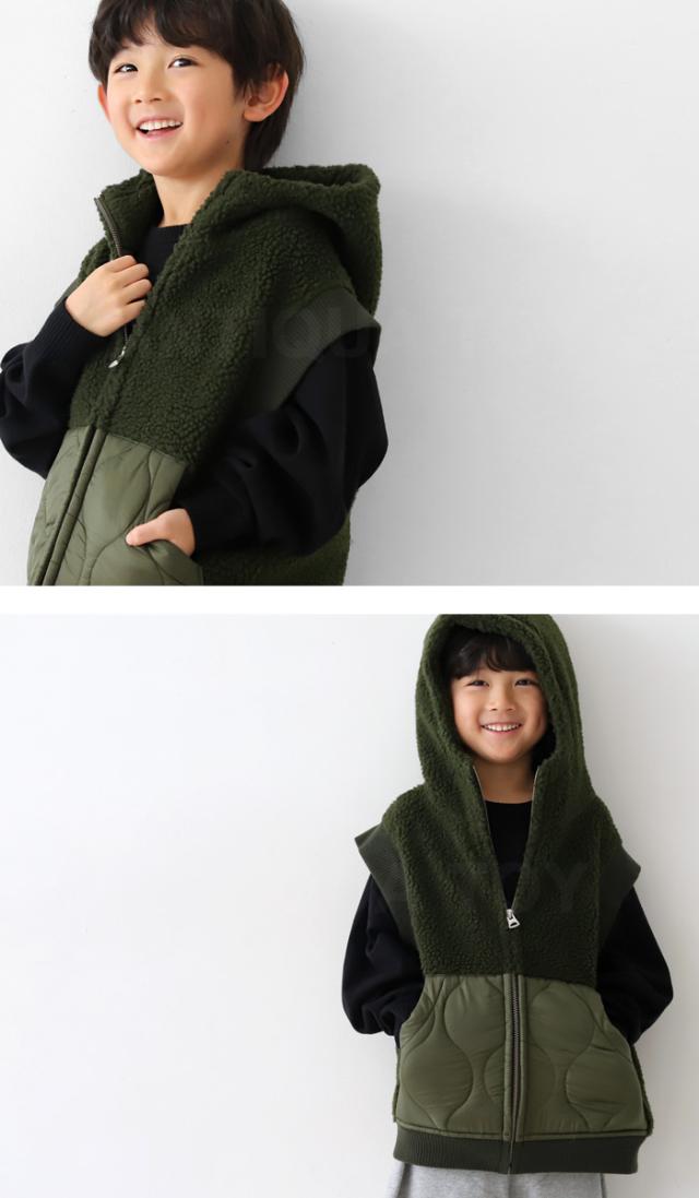 yt-00005 キッズ 子供服 男の子 女の子 ジュニア 低学年 高学年 中学生 中高生 アウター ボア キルティング 異素材 ゆったり 前開き 無地 羽織り ノースリーブ リブ フード
