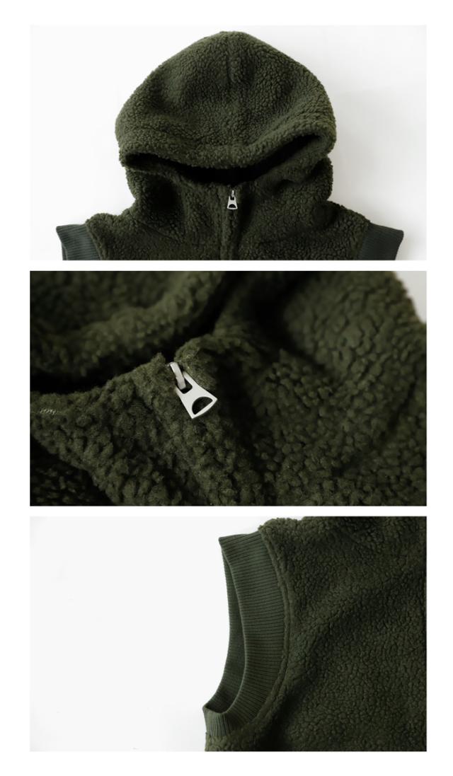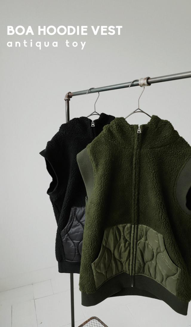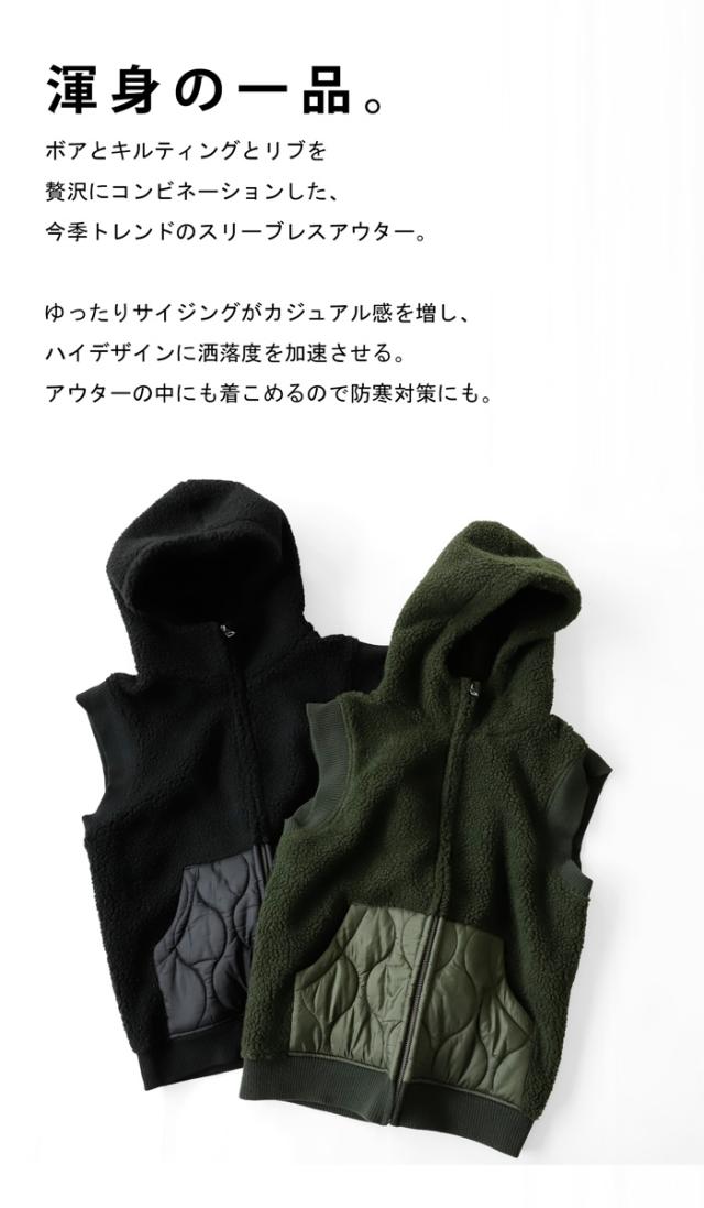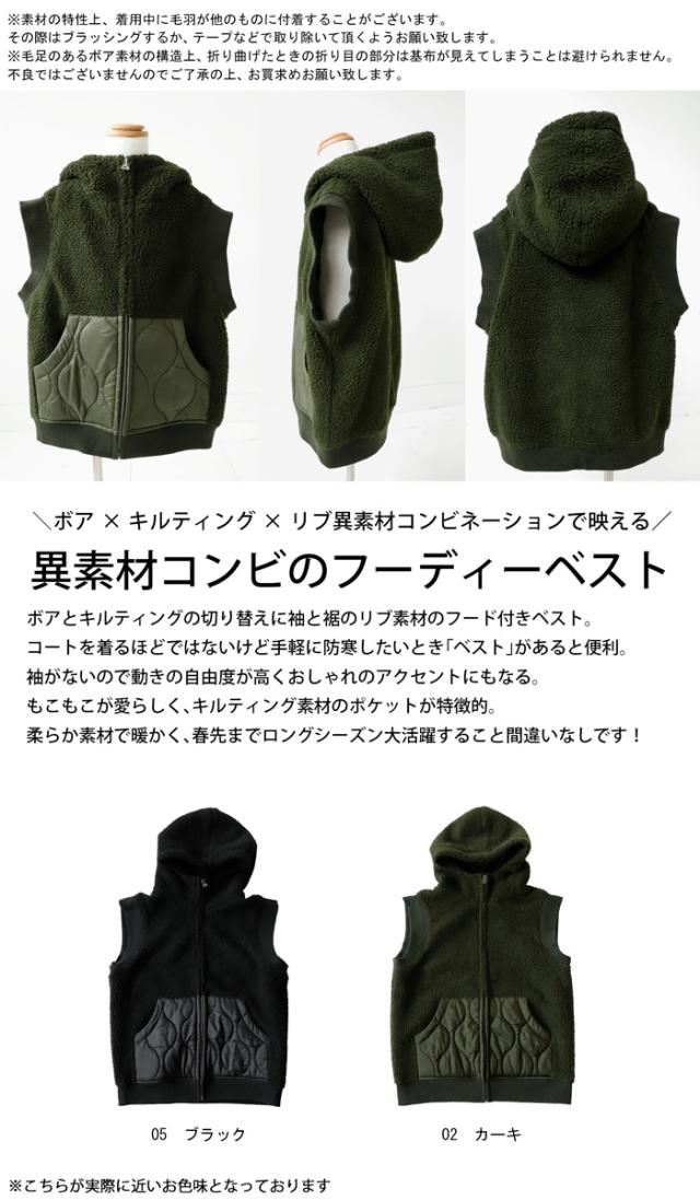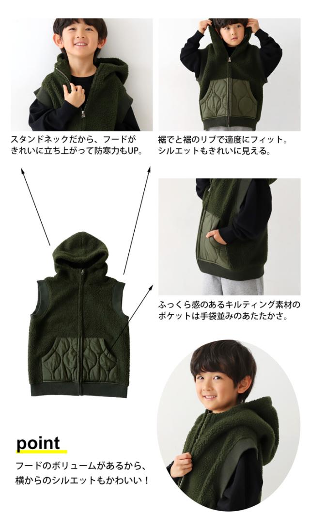 もこもこが愛らしく可愛いフード付きボアベストはキルティング切替ポケットの