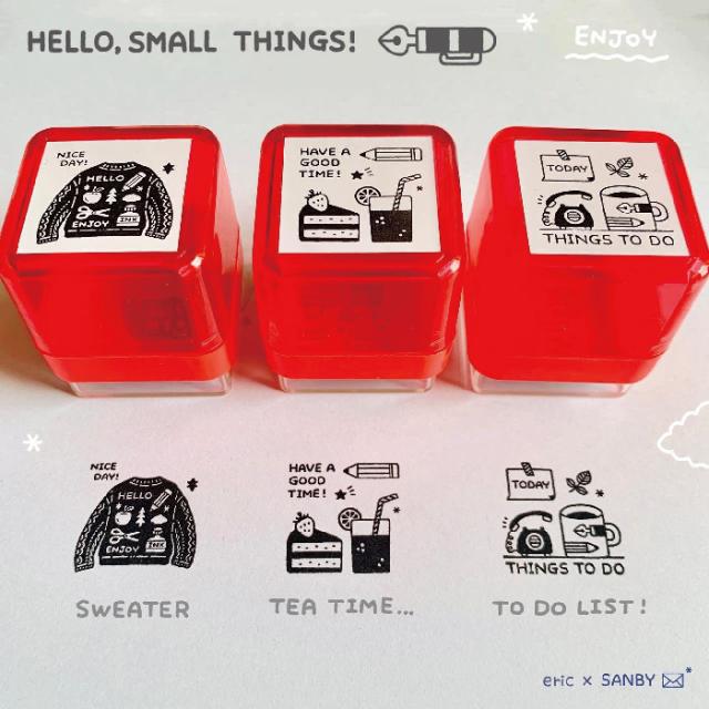 | 仕様 | ●スタンプのサイズ/約32×32×38ミリ ●スタンプ印面サイズ/約21×21ミリ ●種類/おやつ・セーター・THINGS TO DO ● インクの補充は、ミクロポーラス専用補充インクです。 |
