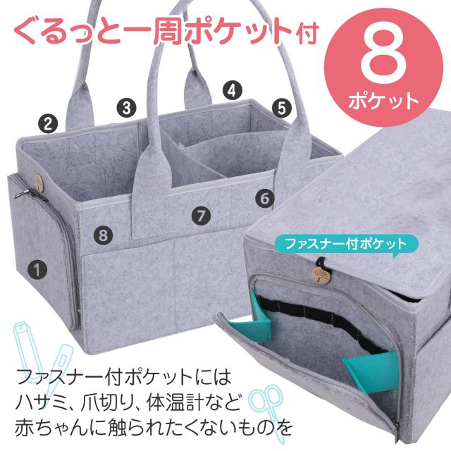 おむつ収納ケースの周囲はぐるっと一周ポケット付き。サイドのファスナーポケットには、ハサミ、爪切り、くし、体温計などを収納できます。ファスナー付きで赤ちゃんに触られる心配がありません。周囲を囲むオープンポケットには、小物を分類して整理できます。