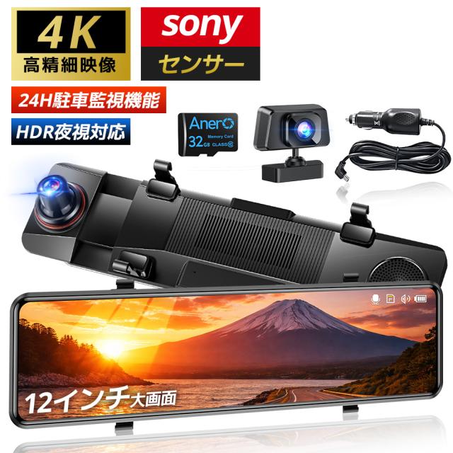 【サンシェードレビュー限定特典】ドライブレコーダー ミラー型 4KフルHD SONYセンサー 12インチ画面 1440P高画質 ドラレコ 前後カメラ 170度超広角