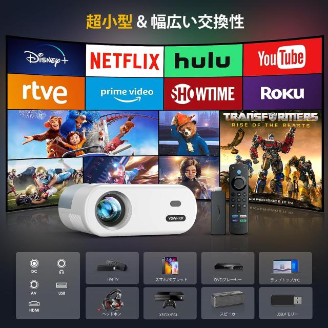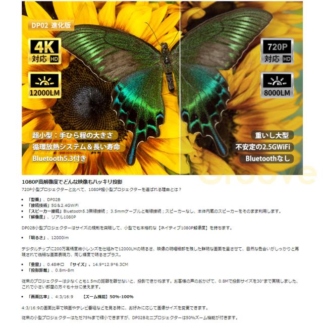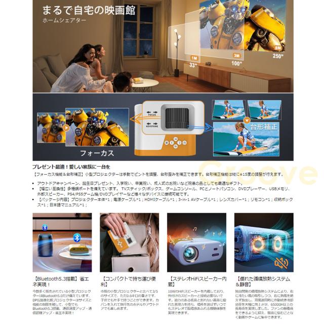 300インチまでの大画面投影可能で、4Kサポート、まるでホームシェアターの雰囲気!市販の小型プロジェクターと比べて3/5のサイズで、ただ0.48キロの重さです、コンパクトと高輝度画質を両立させます。