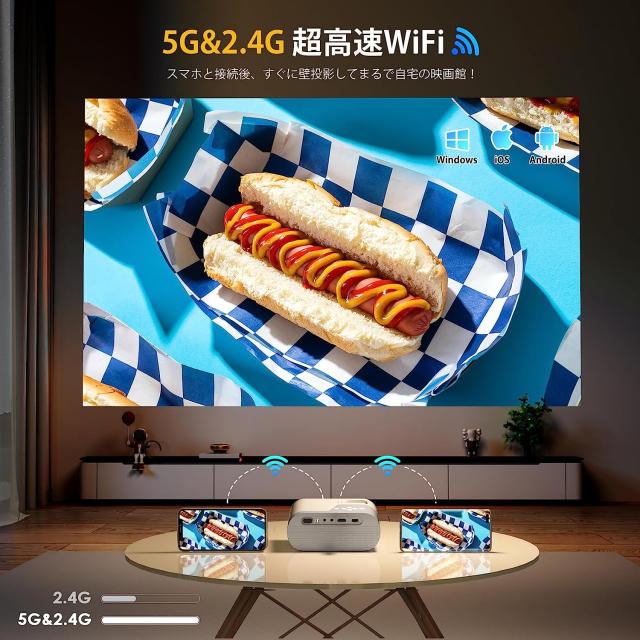 プロジェクター 小型 12000LM 5G WiFi Bluetooth 4K対応 リアル1080P 台形補正 モバイルプロジェクター HiFiスピーカー 天井吊り可 ホームシアター