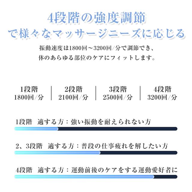 - 所有のマッサージガンが古くなったので買い換え、新品は静かで良い。しかし、4段階の切り替えなので最強でも他者の中位でイマイチかなぁ
