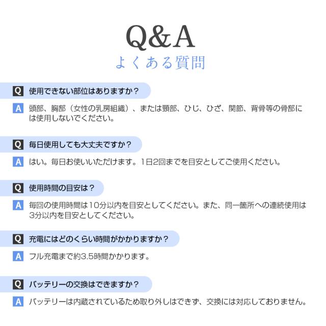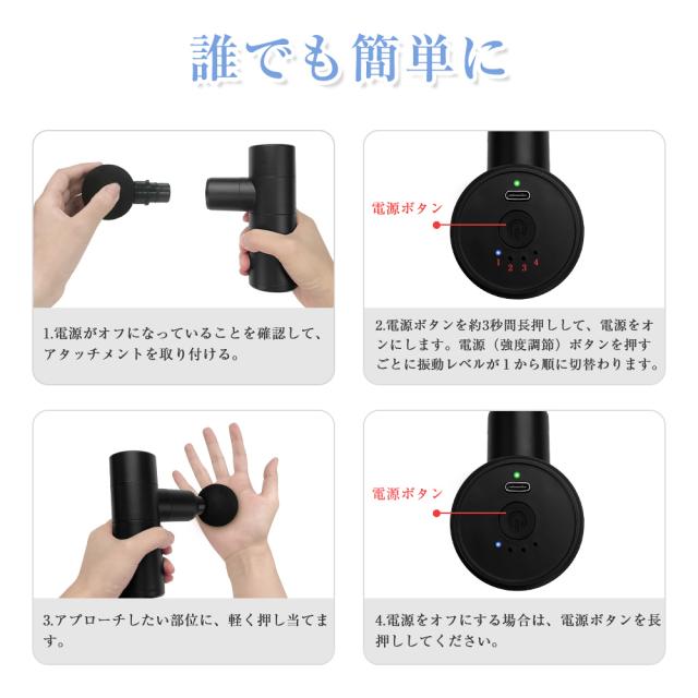 4段階の振動強度で調節可能/10分タイマー/USB充電式/小型軽量・携帯便利/低作動音/低電力消費。
