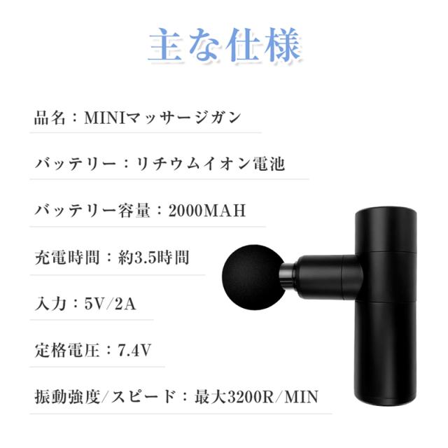 【パッケージリスト】マッサージガン本体、アタッチメントセット、充電ケーブル、日本語取扱説明書。