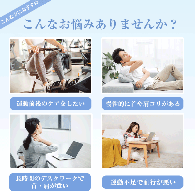 【マッサージガンのメリット】筋膜が張っていると、体が動きにくく、コリや疲れに変わってしまう。運動しても、効率よく体が動かせないばかりか、体を痛めてしまうことも。筋膜リリースガンを使うことで、いつでも簡単に筋膜をほぐし、体の不調を整えることができる。また、リカバリーだけでなく、ウォームアップにも非常に有効です。いつものストレッチの効果が増して、所要時間が短くなり、組織の深部までストレッチされます。