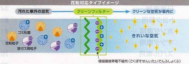 目の細かさと通期性を両立し、さらに素材に帯電性を持たせた特殊製法の極細繊維帯電不織布を採用しました。目の細かい素材と静電気による吸着のダブルの効果で、従来品では対応できなかった花粉ユービッシュ耐などの超微粒子までガッチリとキャッチします。車室内の空気も循環させてクリーンフィルターできれいな空気にします。