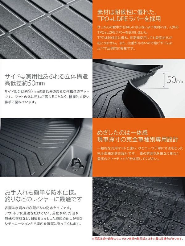 サイド部分は約50mmの高低差のある立体マットです。マットの外に汚れが落ちることなく、機能的で使い勝手に優れています。