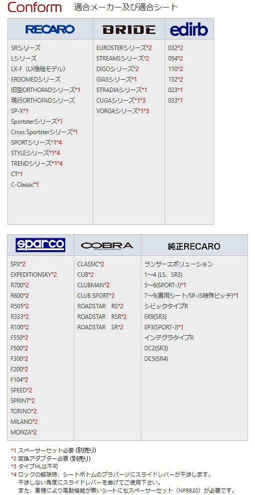 (※4)ロックの解除時、シートボトムのプラパーツにスライドレバーが干渉します。干渉しない角度にスライドレバーを曲げてご使用下さい。また、車種により電動機能が無いシートにもスペーサーセット(NPB820)が必要です。