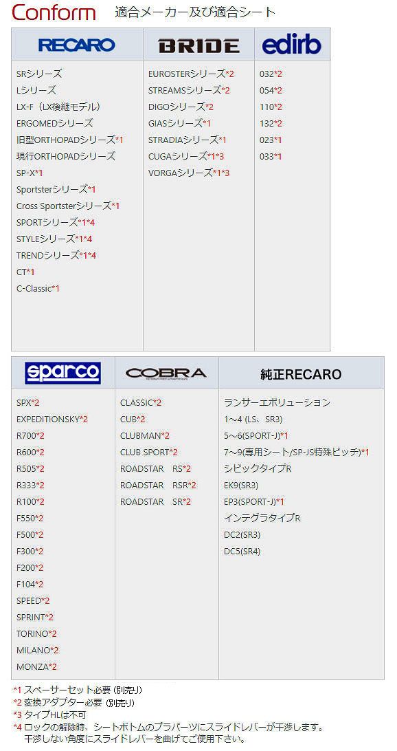 ランサーエボリューション/1〜4 (LS、SR3)/5〜6(SPORT-J※1)/7〜9(専用シート/SP-JS特殊ピッチ※1)/シビックタイプR/EK9(SR3)/EP3(SPORT-J※1)/インテグラタイプR/DC2(SR3)/DC5(SR4)