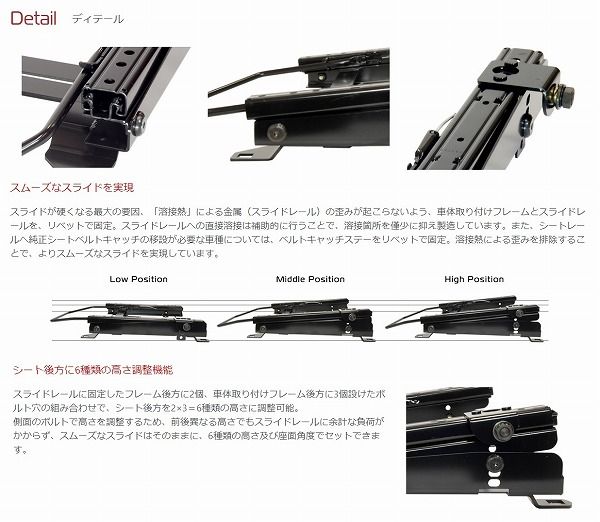 側面のボルトで高さを調整するため、前後異なる高さでもスライドレールに余計な負荷がかからず、スムーズなスライドはそのままに、6種類の高さ及び座面角度でセットできます。