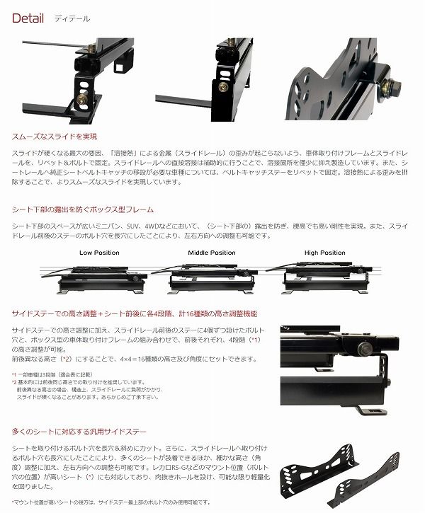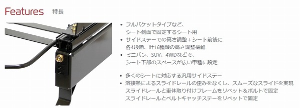 シート下部のスペースが広いミニバン、SUV、4WDなどにおいて、(シート下部の)露出を防ぎ、腰高でも高い剛性を実現。また、スライドレール前後のステーのボルト穴を長穴にしたことにより、左右方向への調整も可能です。